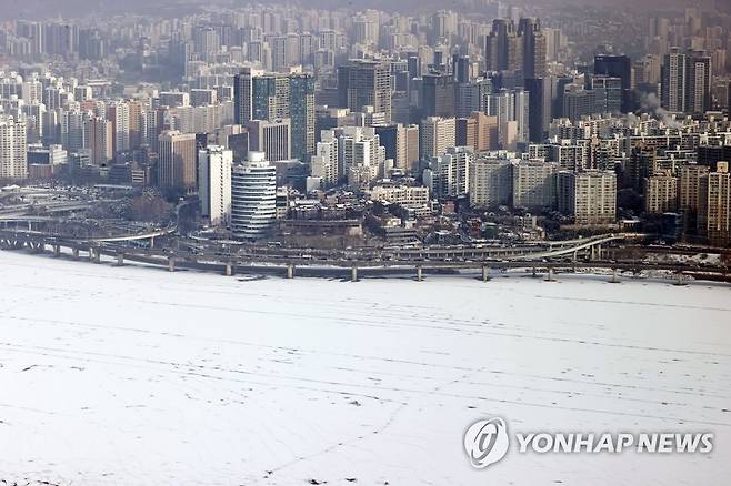(서울=연합뉴스) 김인철 기자 = 13일 서울 영등포구 여의도 63빌딩 전망대에서 바라본 한강 위로 전날 내린 눈이 쌓여있다. 2021.1.13