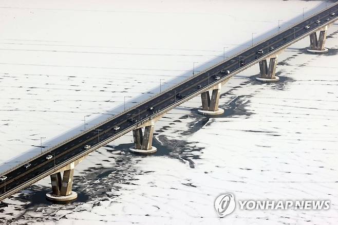 (서울=연합뉴스) 김인철 기자 = 13일 서울 영등포구 여의도 63빌딩 전망대에서 바라본 원효대교 주변 한강 위로 전날 내린 눈이 쌓여있다. 2021.1.13