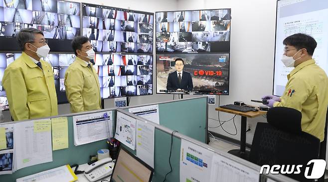 (서울=뉴스1) 송원영 기자 = 서정협 서울시장 권한대행이 13일 오전 서울 동대문구 서울시립대학교 기숙사에 마련된 신종 코로나바이러스 감염증(코로나19) 수도권 생활치료센터에서 현황 보고를 받고 있다. 2021.1.13/뉴스1