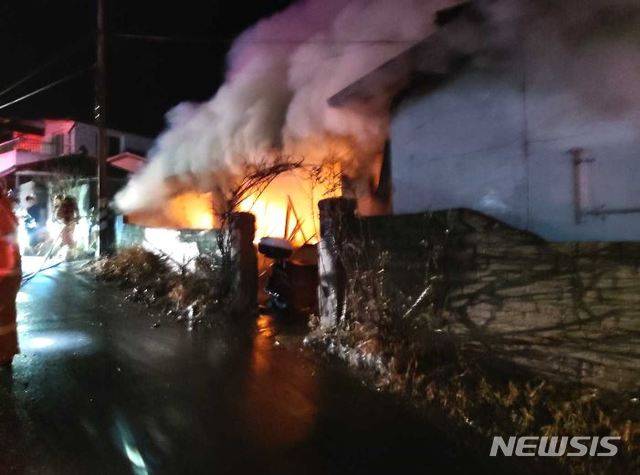 [고성(강원)=뉴시스]김동현 기자 = 13일 오전 강원 고성군 토성면 아야진리 주택에서 화재가 발생해 소방대원들이 진화에 나서고 있다. 2021.01.13. (사진=강원도소방본부 제공) photo@newsis.com