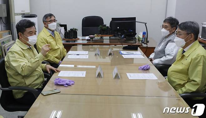 (서울=뉴스1) 송원영 기자 = 서정협 서울시장 권한대행이 13일 오전 서울 동대문구 서울시립대학교 기숙사에 마련된 신종 코로나바이러스 감염증(코로나19) 수도권 생활치료센터에서 서순탁 서울시립대학교 총장 등과 대화를 나누고 있다. 2021.1.13/뉴스1
