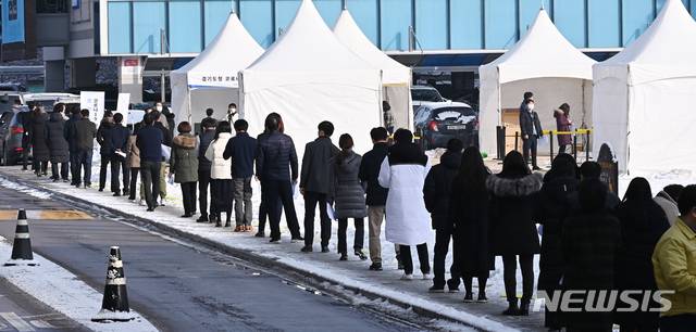 [수원=뉴시스] 김종택기자 = 13일 오전 경기도 수원시 팔달구 경기도청에 마련된 임시선별검사소에서 도청 직원들이 신종 코로나바이러스 감염증(코로나19) 선제검사를 받기위해 줄 서 대기하고 있다. 경기도는 코로나19 무증상 감염자로 인한 지역감염을 막기위해 도청과 공공기관 전 직원 1만2천여명을 대상으로 오는 19일까지 선제적으로 전수검사를 실시한다. 2021.01.13.