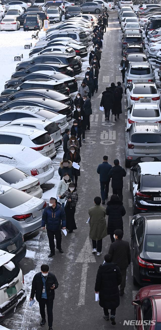 [수원=뉴시스] 김종택기자 = 13일 오전 경기도 수원시 팔달구 경기도청에 마련된 임시선별검사소에서 도청 직원들이 신종 코로나바이러스 감염증(코로나19) 선제검사를 받기위해 줄 서 대기하고 있다. 경기도는 코로나19 무증상 감염자로 인한 지역감염을 막기위해 도청과 공공기관 전 직원 1만2천여명을 대상으로 오는 19일까지 선제적으로 전수검사를 실시한다. 2021.01.13.
