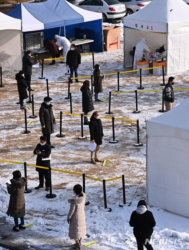 [수원=뉴시스] 김종택기자 = 13일 오전 경기도 수원시 팔달구 경기도청에 마련된 임시선별검사소에서 도청 직원들이 신종 코로나바이러스 감염증(코로나19) 선제검사를 받기위해 줄 서 대기하고 있다. 경기도는 코로나19 무증상 감염자로 인한 지역감염을 막기위해 도청과 공공기관 전 직원 1만2천여명을 대상으로 오는 19일까지 선제적으로 전수검사를 실시한다. 2021.01.13.