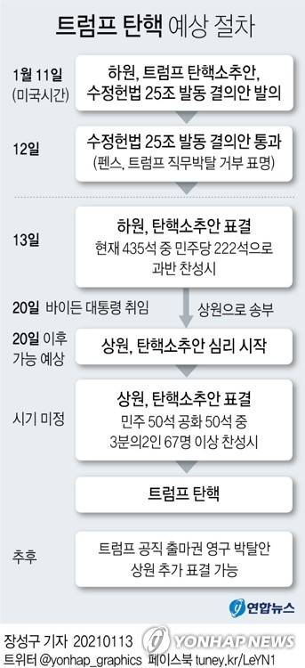 임기가 일주일 가량 남은 현직 대통령에 대한 '친정' 공화당내 탈(脫)트럼프 기류가 표면화함에 따라 제2의 탄핵 정국이 중대 분수령을 맞았다. 13일 하원 표결에서 반란표가 실제 어느 정도 나올지 주목되는 가운데 최종 탄핵 가능성이 높아지는 것 아니냐는 관측도 나온다.