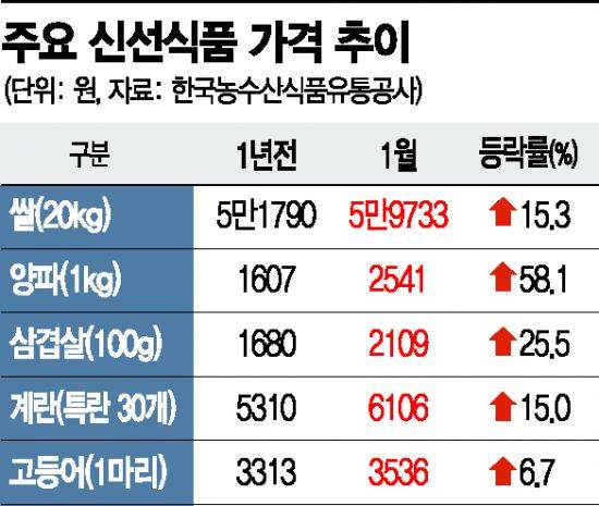 13일 한국농수산식품유통공사에 따르면 쌀 20kg 소매가는 5만9733원으로 전년(5만1790원)과 평년(4만5986원) 대비 각각 15.3%, 29.9% 상승했다. 양파는 전년 대비 58.1% 올랐고 삼겹살은 25%, 달걀도 15% 급등했다. 수산물 가격 역시 고등어가 6.7% 상승하는 등 상승 추세를 이어가고 있다.