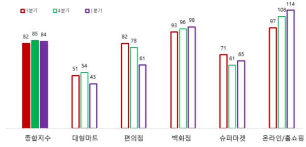 업태별로는 온라인·홈쇼핑 업종만 유일하게 기준치(100)를 넘겼다. 백화점(98)과 슈퍼마켓(65)은 지난 분기보다 다소 높아졌지만, 대형마트(43)와 편의점(61)은 전망치가 큰 폭으로 하락했다.