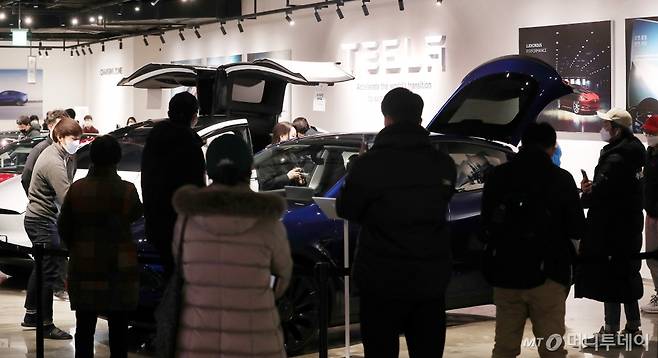 테슬라 코리아가 13일 서울 영등포구 롯데백화점 영등포점에서 '모델 Y'를 국내 최초공개한 가운데 시민들이 차량을 살펴보고 있다.