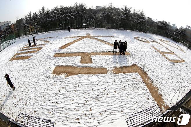 (서울=뉴스1) 이동해 기자 = 비대면 졸업식이 진행된 13일 서울 노원구 태랑초등학교를 찾은 졸업생 가족들이 코로나19 여파로 자녀만 교실에 들여보낸 채 '축졸업'이 적힌 운동장에서 기다리고 있다. 2021.1.13/뉴스1
