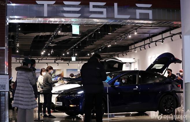 테슬라 코리아가 13일 서울 영등포구 롯데백화점 영등포점에서 '모델 Y'를 국내 최초공개한 가운데 시민들이 차량을 살펴보고 있다.
