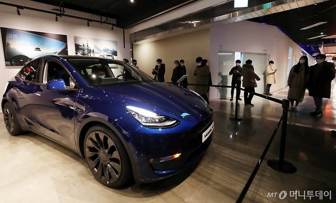테슬라 코리아가 13일 서울 영등포구 롯데백화점 영등포점에서 '모델 Y'를 국내 최초공개한 가운데 시민들이 차량을 살펴보고 있다.