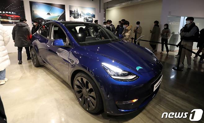사진은 13일 오전 서울 롯데백화점 영등포점에 전시된 테슬라 '모델Y'의 모습. 2021.1.13/뉴스1