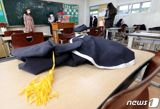 (서울=뉴스1) 이동해 기자 = 비대면 온라인 졸업식이 진행된 13일 서울 노원구 태랑초등학교에서 졸업식을 마친 학생이 서채린 담임선생님과 거리를 둔 채기념사진을 찍고 있다. 2021.1.13/뉴스1