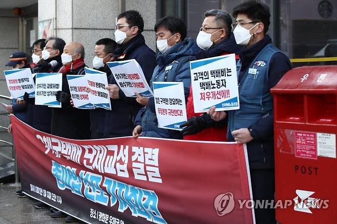 (서울=연합뉴스) 진연수 기자 = 전국택배노동조합 우체국본부 관계자들이 13일 서울 종로구 광화문우체국 앞에서 우체국택배 단체교섭 결렬 총파업 선포 기자회견을 하고 있다. 2021.1.13