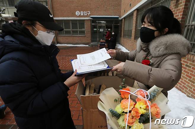 (서울=뉴스1) 사진공동취재단 = 13일 오전 서울 강서구 세현고등학교에서 비대면 화상 졸업식을 마친 학생들이 학교로 등교해 졸업장을 수령하고 있다. 2021.1.13/뉴스1