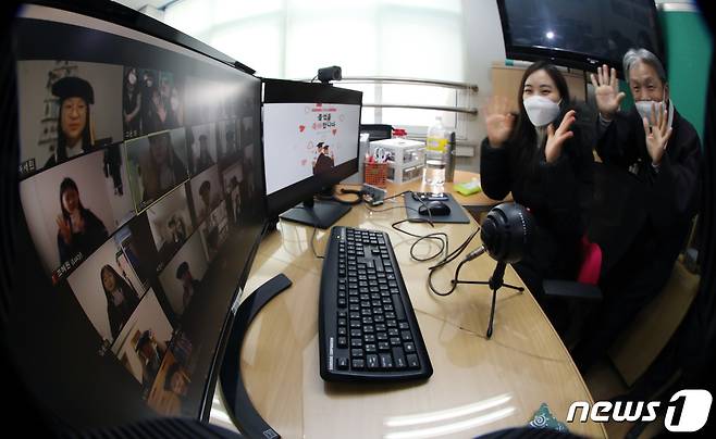 (서울=뉴스1) 이동해 기자 = 13일 서울 노원구 태랑초등학교에서 열린 비대면 온라인 졸업식에서 정해웅 교장선생님을 비롯한 6학년 담임 선생님이 학생들과 작별 인사를 나누고 있다. 2021.1.13/뉴스1