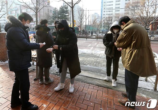 (서울=뉴스1) 사진공동취재단 = 13일 오전 서울 강서구 세현고등학교에서 비대면 화상 졸업식을 마친 학생들이 졸업장과 상장 수령을 위해 체온측정 후 학교로 들어가고 있다. 2021.1.13/뉴스1