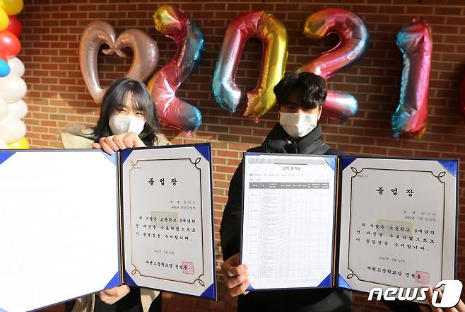 (서울=뉴스1) 사진공동취재단 = 13일 오전 서울 강서구 세현고등학교에서 비대면 화상 졸업식을 마친 학생들이 학교로 등교해 수령한 졸업장을 들어보이고 있다.2021.1.13/뉴스1