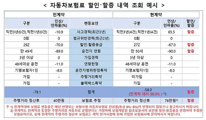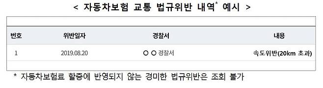 조회시스템에서 운전자 자동차보험 갱신 전·후 계약의 보험료 할인·할증과 관련된 사고건수, 법규위반건수, 할인·할증 등급, 연령, 가입경력, 연령한정특약 가입여부 등 상세 내역을 제공한다.