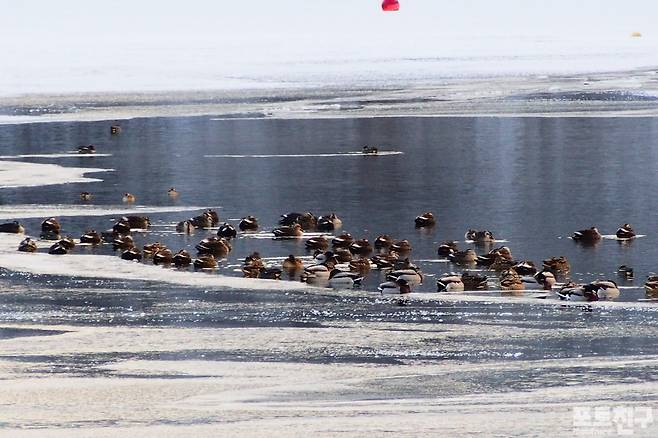 방동저수지 결빙이 안된 곳에서 매서운 추위를 피해 밀접해 있는 오리들 방역당국 지시를 따르지 않을 모양입니다.