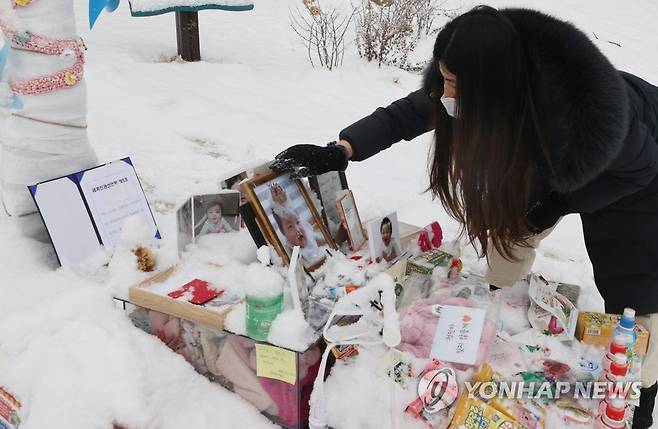 (양평=연합뉴스) 서명곤 기자 = 13일 오전 경기도 양평군 하이패밀리 안데르센 공원묘원에서 한 시민이 양부모의 학대로 생후 16개월 만에 숨진 정인 양을 추모하고 있다.