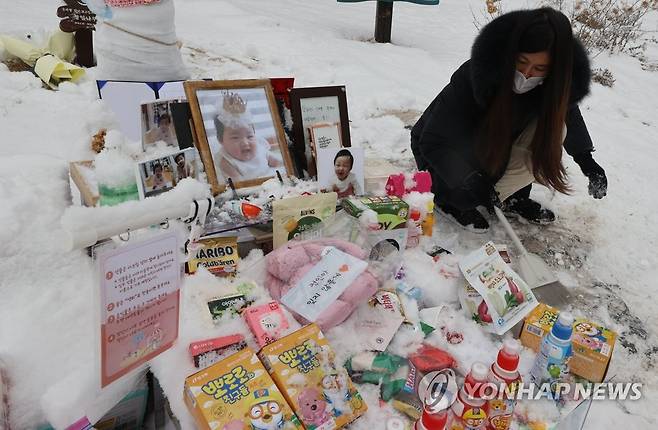 (양평=연합뉴스) 서명곤 기자 = 13일 오전 경기도 양평군 하이패밀리 안데르센 공원묘원에서 한 시민이 양부모의 학대로 생후 16개월 만에 숨진 정인 양을 추모한 뒤