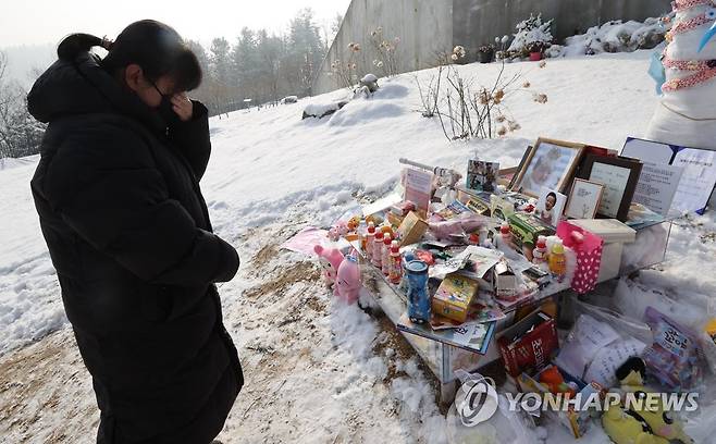 (양평=연합뉴스) 서명곤 기자 = 13일 오전 경기도 양평군 하이패밀리 안데르센 공원묘원에서 한 시민이 양부모의 학대로 생후 16개월 만에 숨진 정인 양을 추모하고 있다.