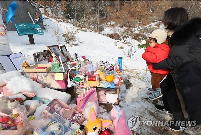 (양평=연합뉴스) 서명곤 기자 = 13일 오전 경기도 양평군 하이패밀리 안데르센 공원묘원에서 엄마와 함께 온 한 아이가 양부모의 학대로 생후 16개월 만에 숨진 정인 양을 추모하고 있다.