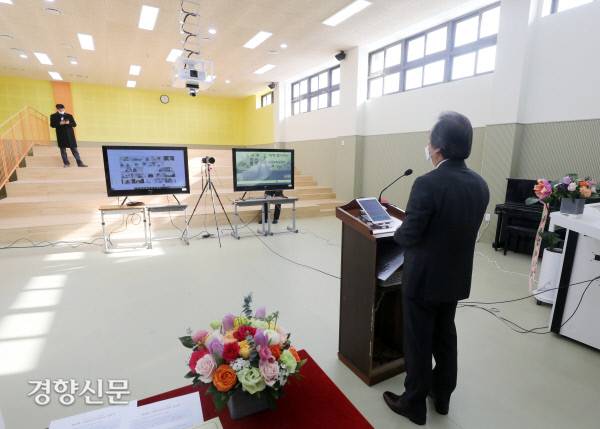 서울 용산구 원효초등학교 제38회 졸업식이 코로나19로 비대면으로 진행된 13일 정한주 교장선생님이 회고사를 하고 있다. 졸업생과 학부모들은 온라인으로 접속해 실시간으로 졸업식에 참석했다. 이날 99명이 졸업했다.