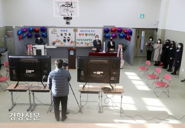서울 용산구 원효초등학교 제38회 졸업식이 코로나19로 비대면으로 진행된 13일 교장·교감선생님과 6학년 담임선생님들이 국민의례를 하고 있다. 졸업생과 학부모들은 온라인으로 접속해 실시간으로 졸업식에 참석했다.
