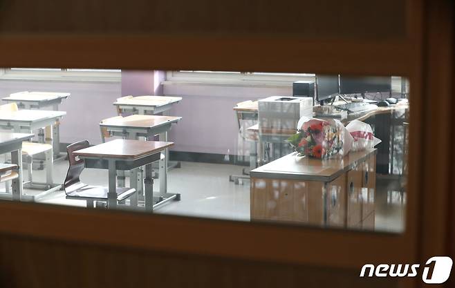 (서울=뉴스1) 사진공동취재단 = 13일 코로나19로 비대면 졸업식이 진행된 서울 원효초등학교 6학년 교실 교탁 위에 꽃다발이 놓여 있다. 졸업생과 학부모들은 온라인으로 접속해 실시간으로 졸업식에 참석했다. 2021.1.13/뉴스1