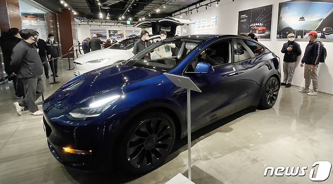 사진은 13일 오전 서울 롯데백화점 영등포점에 전시된 테슬라 '모델Y'의 모습.