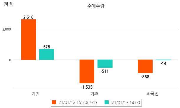 투자자별 동향을 살펴보면 기관은 511억원 순매도했으며, 외국인도 14억원 순매도했다.