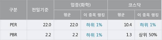 전일 종가를 기준으로 이 종목의 PER는 22.0배, PBR은 2.2배이다. PER는 화학업종의 평균 PER 22.0배와 동일한 수준으로 업종 내에서 하위 1%에 있고, PBR은 화학업종의 평균 PBR 2.2배와 동일한 수준으로 업종 내에서 하위 1%에 위치한다. 보통 낮은 PER는 현재 시장이 해당 기업의 가치를 상대적으로 낮게 평가하고 있다고 해석될 수 있다.