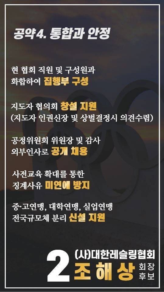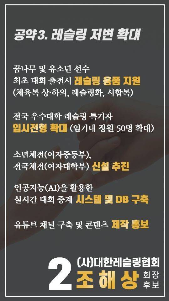 중견 식품업체 해마로와 부어치킨 회장을 겸하고 있는 조해상 당선인은 협회 재정 확보와 지원, 레슬링 경기력 및 국제경쟁력 강화, 레슬링 저변 확대, 분열된 협회의 통합과 안정 등 4가지 공약을 내세워, 현장 레슬링인들의 적극적 지지에 힘입어 당선의 영예를 안았다. 특히 매년 협회 발전기금 5억원 지원, 전국 17개 시도 협회 운영비 500만원 지원, 전국대회 참가선수 1인당 2만원씩 지원, 지도자 건강검진 비용 지원, 심판활동비 인상, 공식 메인후원업체 5개사 추가 협약 체결 등 현실적인 공약들이 호응을 얻었다. 조 당선인은 대의원 총회 후 4년 임기를 시작한다.