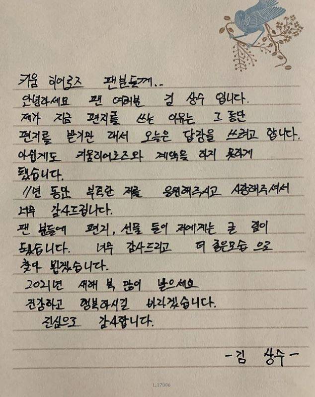 김상수는 1월13일 개인 SNS에 자필 편지를 통해 그동안 자신을 응원해준 키움 히어로즈 팬들에게 감사 인사를 전했다.