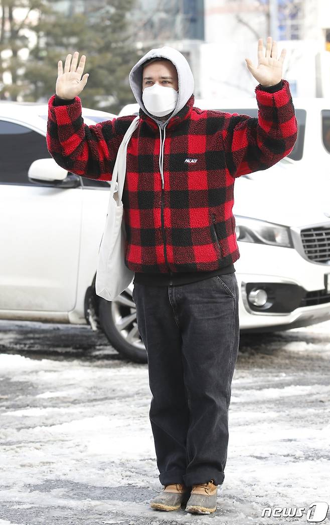 (서울=뉴스1) 권현진 기자 = 방송인 샘 해밍턴이 13일 서울 영등포구 여의도 KBS에서 열리는 KBS 2TV '트롯 전국체전' 촬영 차 방송국으로 들어서며 인사를 하고 있다. 2021.1.13/뉴스1