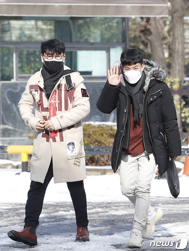 (서울=뉴스1) 권현진 기자 = 가수 조항조, 나태주(오른쪽)가 13일 서울 영등포구 여의도 KBS에서 열리는 KBS 2TV '트롯 전국체전' 촬영 차 방송국으로 들어서고 있다. 2021.1.13/뉴스1