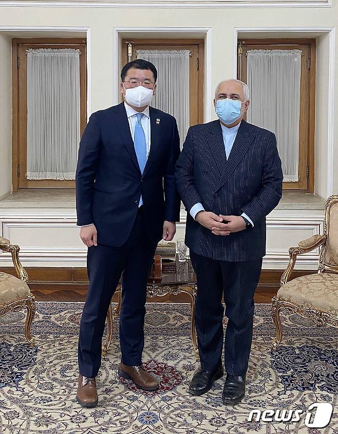 (서울=뉴스1) = 외교부는 최종건 1차관이 지난 10일(현지시간)부터 이란에서 한국 선박 억류에 대해 항의하고, 조속한 해제를 요구했다고 12일 전했다. 최 차관이 모하마드 자바드 자리프 이란 외교장관과 면담 후 기념촬영을 하고 있다. (외교부 제공) 2021.1.13/뉴스1
