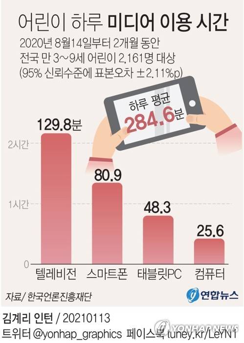 (서울=연합뉴스) 장예진 기자 = 13일 한국언론진흥재단이 발표한 '2020 어린이 미디어 이용 조사'에 따르면 만 3∼9세 어린이의 TV, 스마트폰, 태블릿PC, 컴퓨터 등 4대 매체 이용 시간은 284.6분으로 집계됐다. 이 가운데 TV를 시청한 시간이 129.8분으로 가장 길었다.