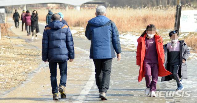 [전주=뉴시스] 김얼 기자 = 전국적으로 영상의 기온을 보이는 13일 오후 전북 전주시 전주천변 산책로에 시민들이 햇살을 받으며 산책을 즐기고 있다. 2021.01.13.