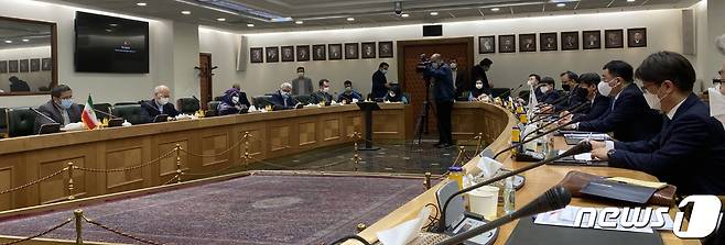 (서울=뉴스1) = 외교부는 최종건 1차관이 지난 10일(현지시간)부터 이란에서 한국 선박 억류에 대해 항의하고, 조속한 해제를 요구했다고 12일 전했다. 최 차관이 압돌나세르 헤마티 중앙은행 총재 등과 간담회를 하고 있다. (외교부 제공) 2021.1.13/뉴스1