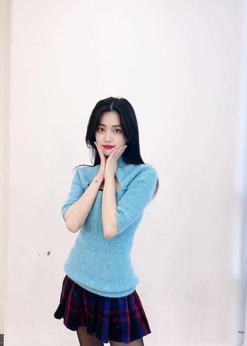 공개된 사진 속 이유비는 하늘색 스웨터에 체크 스커트를 입고 다양한 포즈를 취하고 있다.