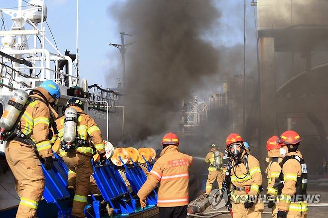 (속초=연합뉴스) 이종건 기자 = 13일 오후 강원 속초시 청초호 속초항 수협 부두 앞에 정박해 있던 어선에서 불이나 출동한 소방관들이 진화작업을 벌이고 있다.