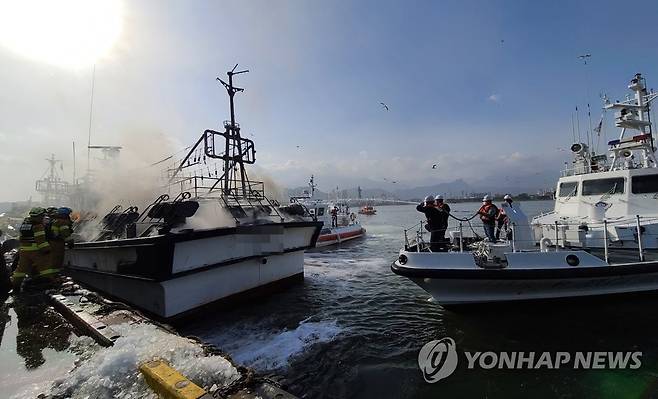 (속초=연합뉴스) 이종건 기자 = 13일 오후 강원 속초시 청초호 속초항 수협 부두 앞에 정박해 있던 어선에서 불이나 출동한 소방관과 속초해경 직원들이 진화작업을 벌이고 있다.