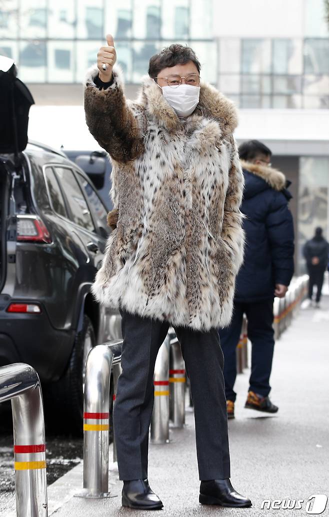 (서울=뉴스1) 권현진 기자 = 가수 남진이 13일 서울 영등포구 여의도 KBS에서 열리는 KBS 2TV '트롯 전국체전' 촬영 차 방송국으로 들어서며 엄지를 치켜들고 있다. 2021.1.13/뉴스1