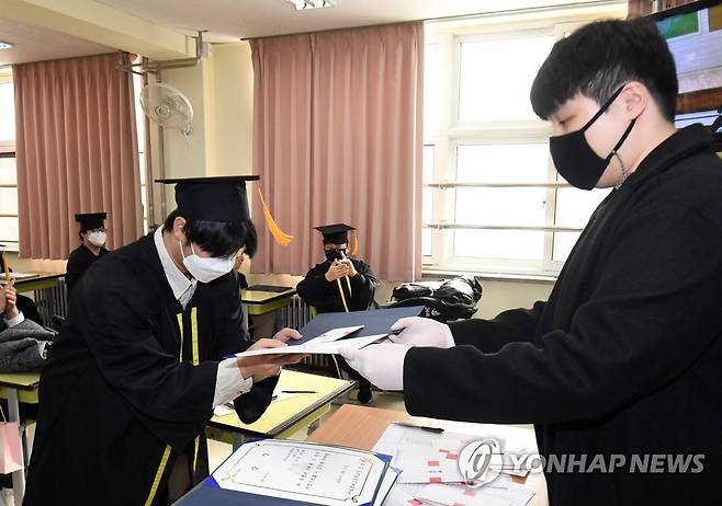 (서울=연합뉴스) 13일 서울 강남구 로봇고등학교에서 졸업을 맞은 3학년 학생이 졸업장을 받고 있다. 2021.1.13 [사진공동취재단]
