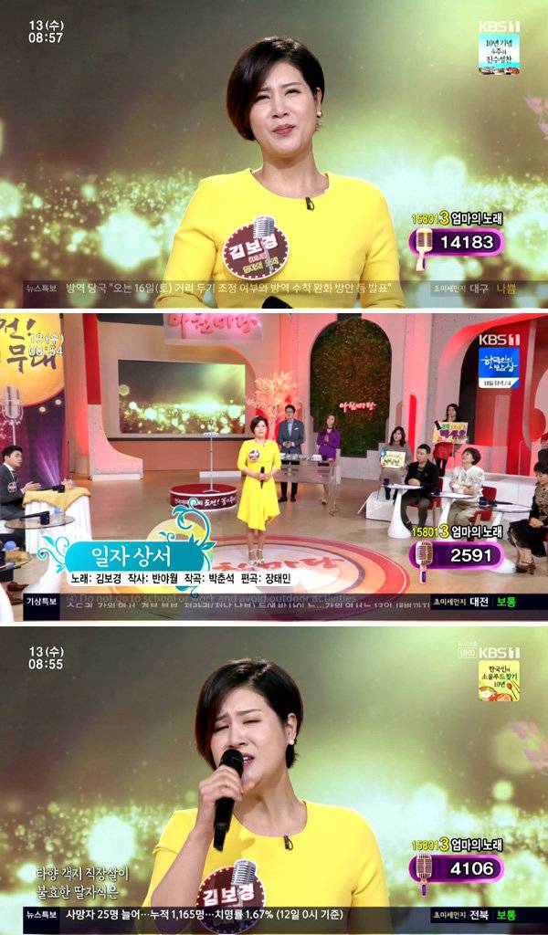 13일 오전 방송된 KBS1TV ‘아침마당-도전 꿈의 무대’에 출연해 “당당한 엄마로 살기 위해 열심히 노래하는 김보경입니다”라고 자신을 소개한 후 어릴 적 부모님이 이혼해 할머니 손에 자란 사연을 전하며 말문을 열었다.