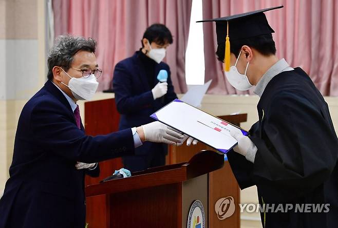 (서울=연합뉴스) 13일 졸업식이 열린 서울 강남구 로봇고등학교에서 강상욱 교장이 3학년 학생에게 상장을 수여하고 있다. 2021.1.13 [사진공동취재단]