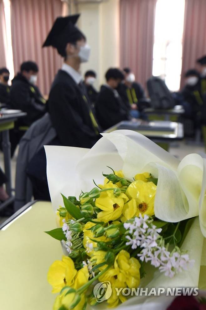 (서울=연합뉴스) 13일 졸업식이 열린 서울 강남구 로봇고등학교의 3학년 교실 책상 위에 꽃다발이 놓여있다. 2021.1.13 [사진공동취재단]